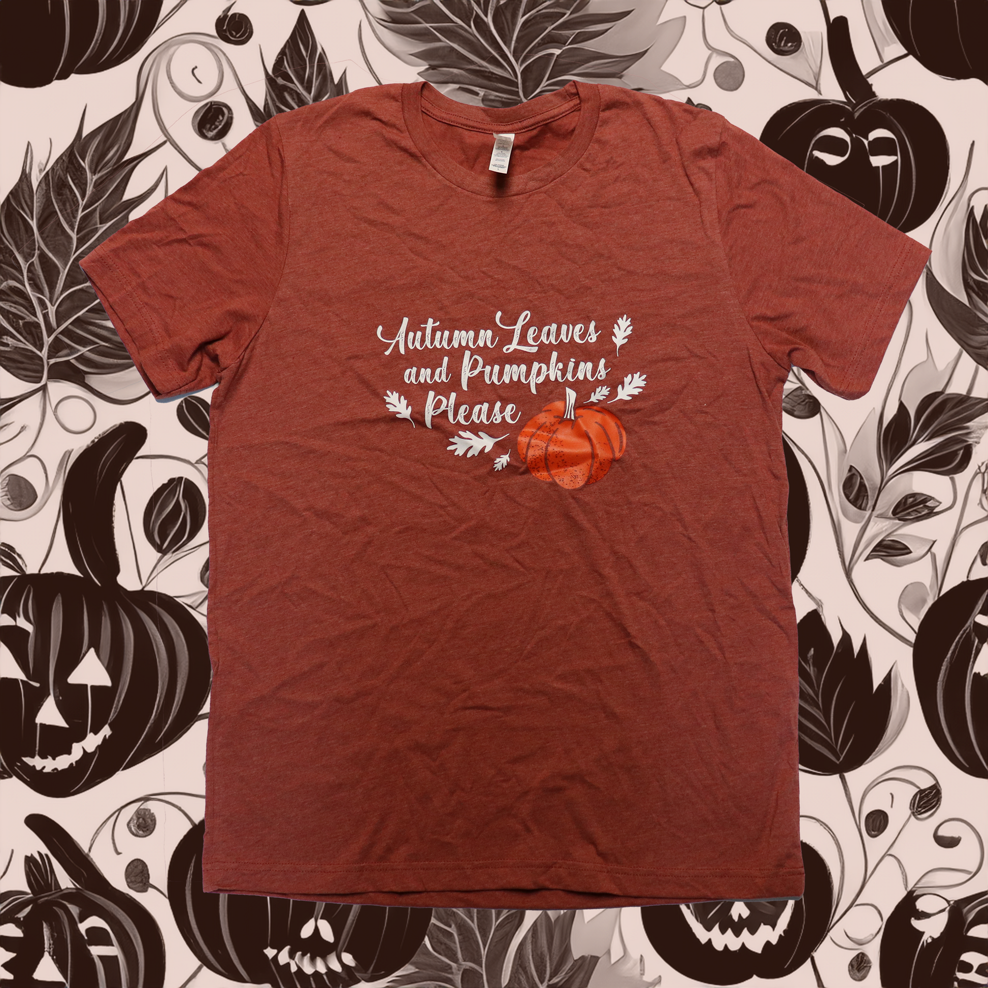 Womens AUTUMN LEAVES AND PUMPKINS PLEASE T-Shirt for a woman who loves the fall / autumn season and Halloween.