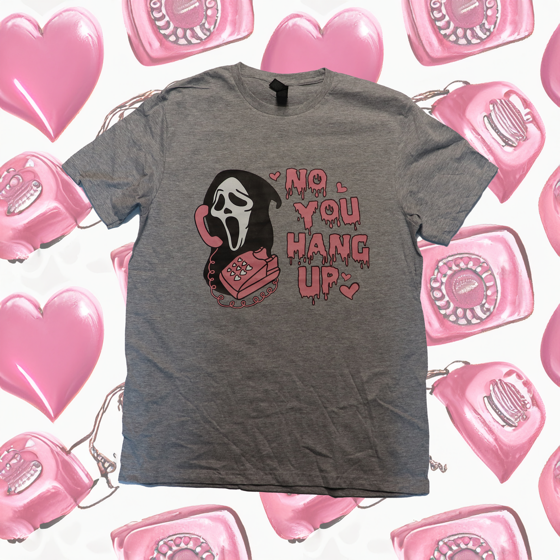 Womens NO YOU HANG UP Tee for the fall / autumn season. Makes a good gift for Halloween for a woman who loves scary movies.