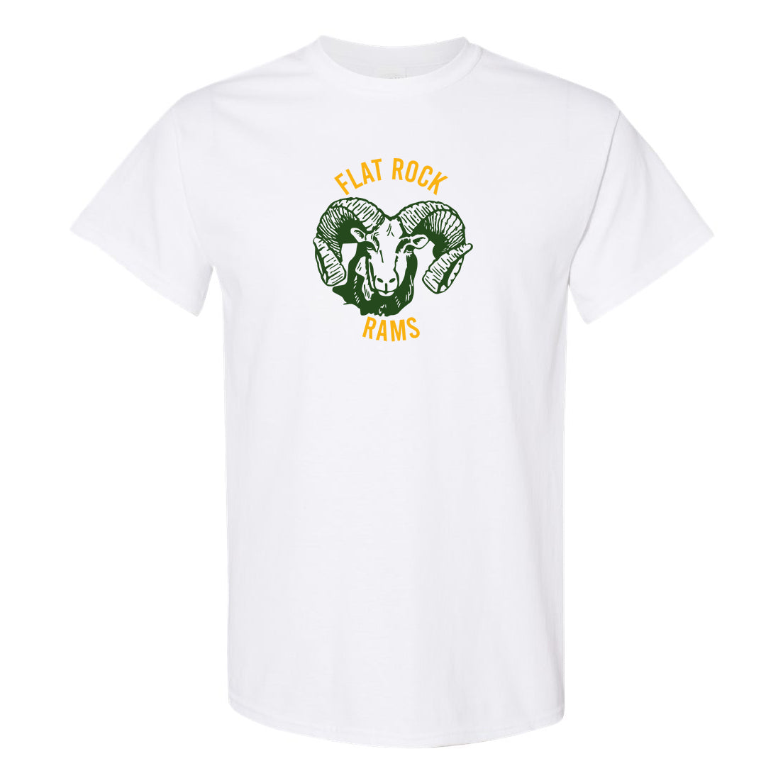 Show off your Flat Rock High School spirit with this Flat Rock Rams Tee on White Gildan brand. Front of tee imprint only. Available with green Ram or gold Ram.