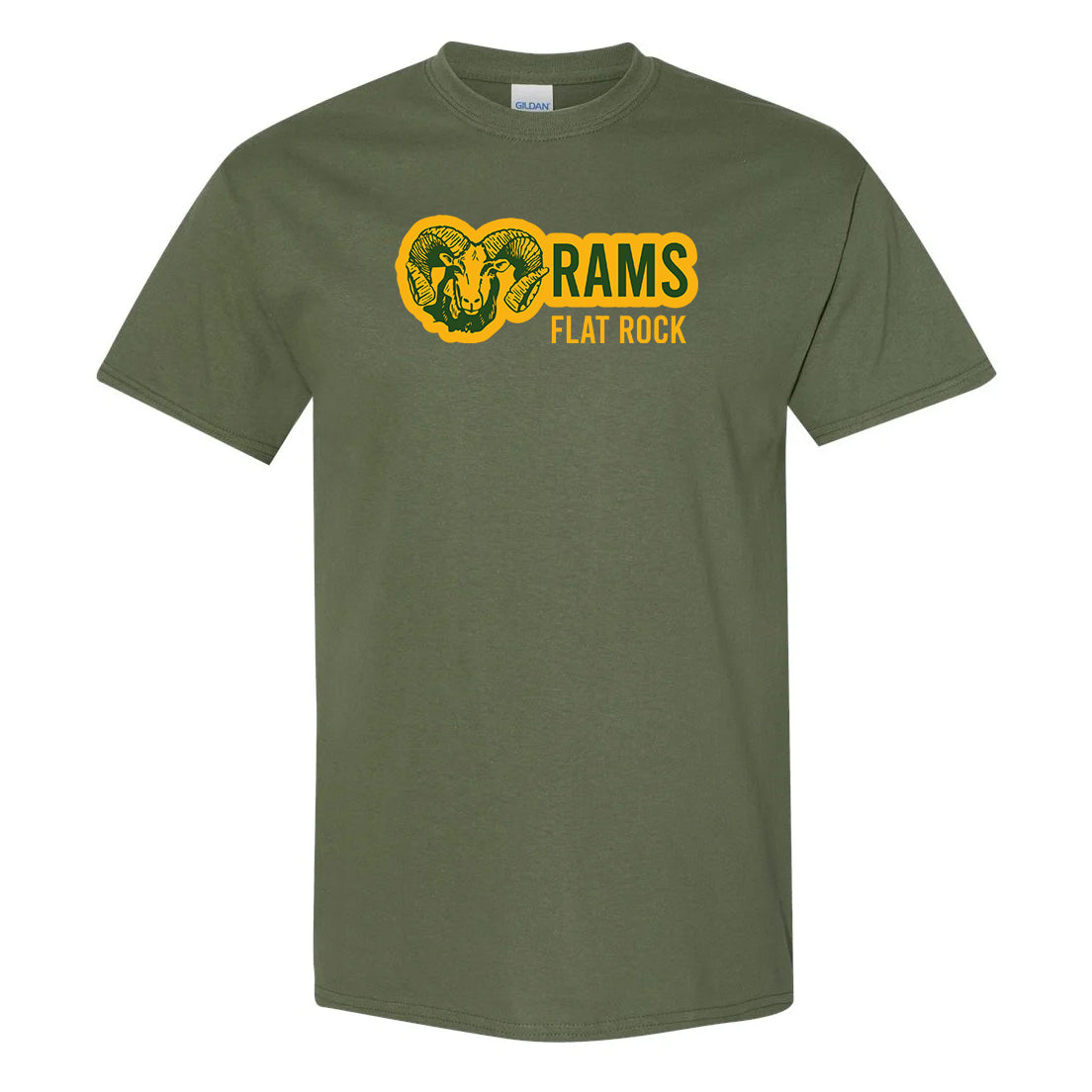 Show off your Flat Rock High School spirit with this Flat Rock Rams Tee on White or Military Green Gildan brand. Front of tee imprint only.