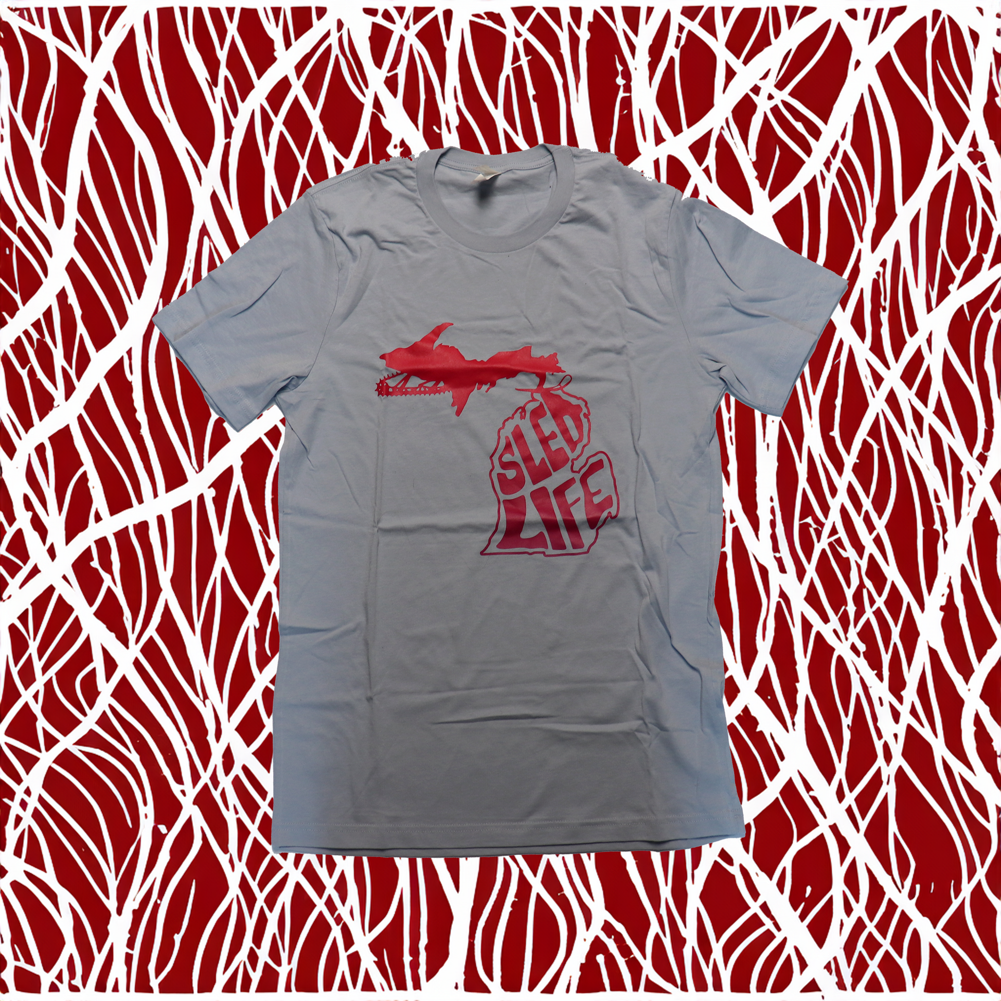 Womens MICHIGAN SLED LIFE Tee for a woman who loves the cold winter weather sport of sledding in the state of Michigan.